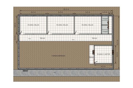 Wir planen den Bau von drei offenen Klassenräumen, die alle in einem Block untergebracht sind und bei Bedarf durch Holzregale voneinander getrennt werden können. Zusätzlich wird es einen Raum für die Verwaltung, sanitäre Anlagen und einen Spielplatz geben.