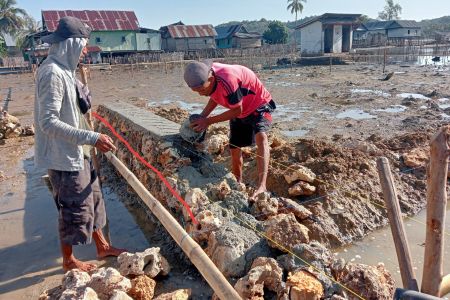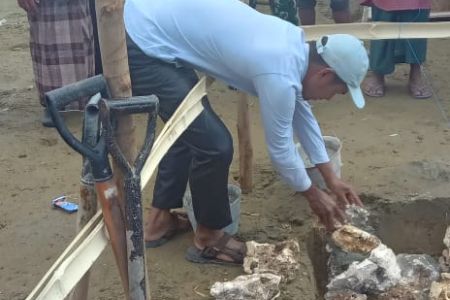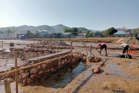 Eine besondere Herausforderung bei diesem Projekt ist die Nähe des Grundstücks zum Meer. Bei Flut wird ein großer Teil von Bari, insbesondere bei Vollmond, bis zu 50 cm hoch überschwemmt. Daher müssen wir ein bis zu 1 Meter hohes Fundament aus Steinen und Zement errichten, bevor wir mit dem Bau der Räume beginnen können.