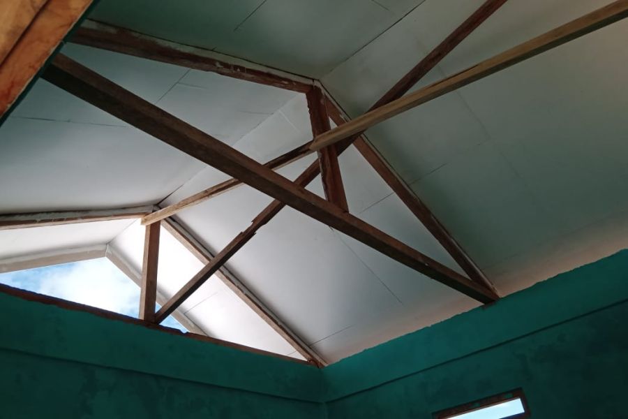 - Bau von drei offenen Klassenräumen in einem Block, durch Holzregale trennbar